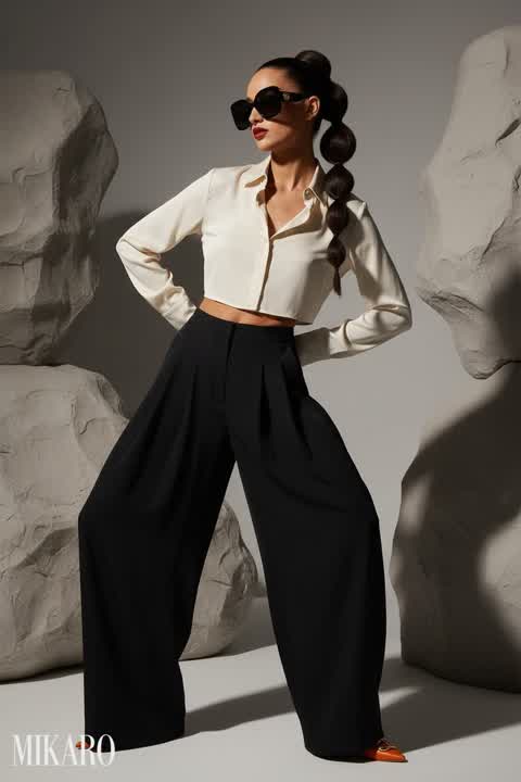This outfit blends classic sophistication with modern flair. The patterned top is eye-catching, and the skirt's gold zippers add a chic detail, making it perfect for both professional and stylish occasions.