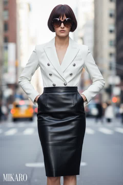 The tailored suit offers a polished and sophisticated look, enhanced by the oversized sunglasses. The combination exudes a confident and modern elegance, though the round buttons on the blazer feel a bit too traditional for the avant-garde makeup.