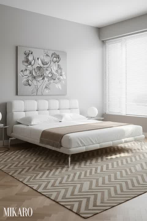 The selection of these pieces within a Bauhaus context works by focusing on clean lines, functional forms, and a neutral color palette. The fluted mango wood chandelier, while possessing an artisan quality, is subtly integrated to provide a soft, diffused light that complements the geometric precision of Bauhaus. The ivory rug introduces texture and warmth without disrupting the minimalist ethos. The coffee table, despite its 'farmhouse' origin, is recontextualized; its dark, solid structure and clean top align with the functional and geometric principles of Bauhaus, providing essential storage and a stable central point. The overall effect is one of understated elegance and intelligent design.