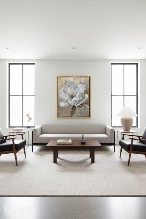 Bauhaus Living Room: Minimalist Luxury with Artisan Chandelier & Modern Farmhouse Coffee Table