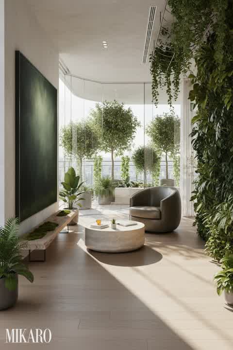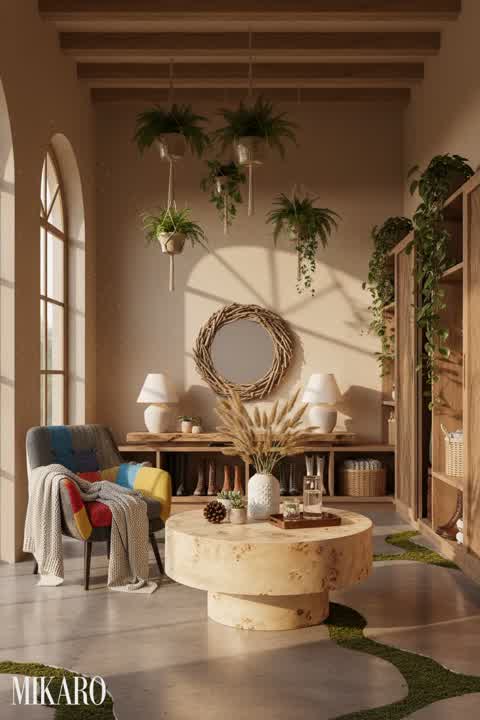The composition successfully blends the requested elements into a biophilic snug within a utility room. The contrast between the raw concrete and the lush greenery creates an interesting dynamic. While the overall aesthetic is pleasing, the placement of a washing machine directly adjacent to such a serene space feels a bit jarring, making it less of a true 'snug' and more of a beautifully decorated utility corner. However, the golden hour lighting and material richness are quite captivating.