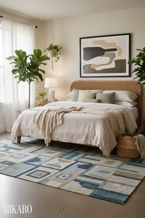 This composition effectively blends the bold patterns of the rug with the abstract elegance of the art, creating a sophisticated yet relaxed bohemian space. The chosen color palette of neutrals, gold, and earthy tones works harmoniously. While the floor lamp has a distinctly modern aesthetic, its dark metal finish and unique silhouette provide an interesting contrast that surprisingly complements the eclectic bohemian elements rather than clashing. The placement of all elements feels natural and functional, creating an inviting and well-curated environment that people would likely find inspiring for a high-traffic living room.