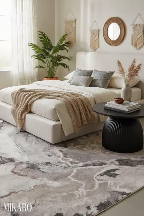 The bohemian style is perfectly executed here by blending rich textures and vibrant accents. The indigo rug grounds the space with its artisanal feel, while the hand-blown Murano-style vases introduce a splash of vibrant color and organic form. The minimalist gold table lamp adds a touch of modern luxury without detracting from the overall free-spirited aesthetic, ensuring a harmonious balance between comfort and curated design.