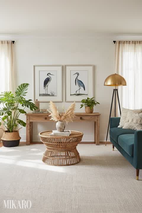 Bohemian Living Room Oasis: Indigo Wool Rug, Murano Vases & Gold Lamp Decor