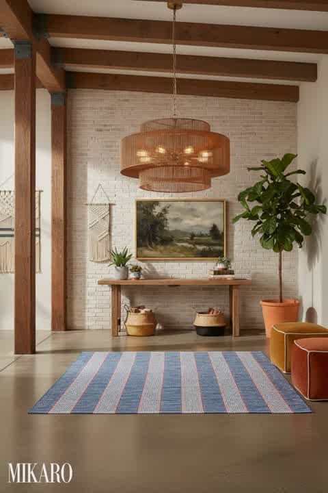 The composition successfully blends the requested products into a Bohemian-inspired window seat area within a modern pavilion. The rug and the landscape art piece surprisingly complement the Bohemian aesthetic with their muted tones and organic patterns. However, the mid-century coffee table, while elegant, feels a bit out of place with its stark lines against the otherwise soft and eclectic Bohemian elements.