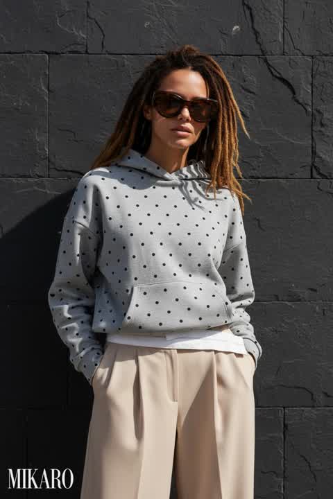 The oversized camo hoodie and flowy black maxi skirt create an interesting, comfortable contrast.