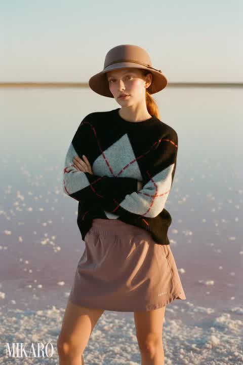 This outfit perfectly blends classic elegance with a playful modern twist. The houndstooth sleeves add visual interest, and the blue cat-eye glasses provide a chic pop of color. It's a cohesive and stylish look.