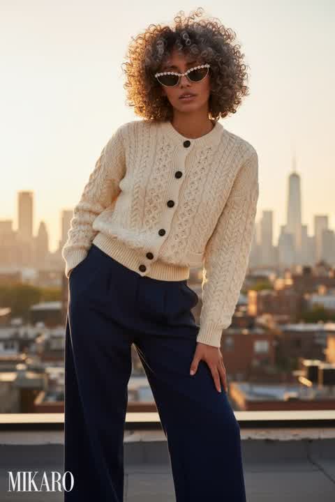 The combination of the cozy knit top and chic tweed skirt creates a balanced and stylish outfit. The textures complement each other well for a refined yet contemporary appeal.