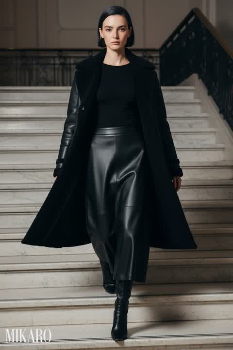 The contrasting textures of the sleek leather coat and the soft, draped trousers create an interesting dynamic. The overall silhouette is contemporary and effortlessly chic, making a strong style statement.