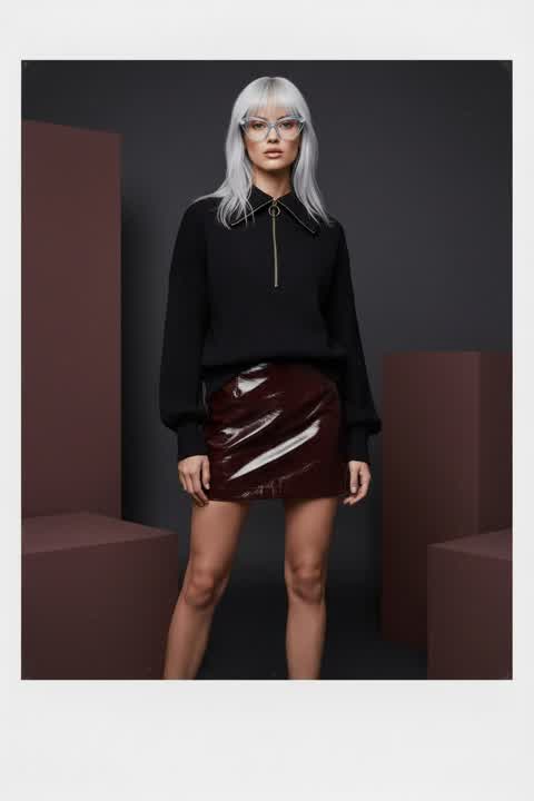 The combination of the formal blazer with the casual skirt and the frosted hair creates an unexpected yet stylish contrast. The sunglasses add a cool, mysterious touch, fitting the high-contrast lighting well.