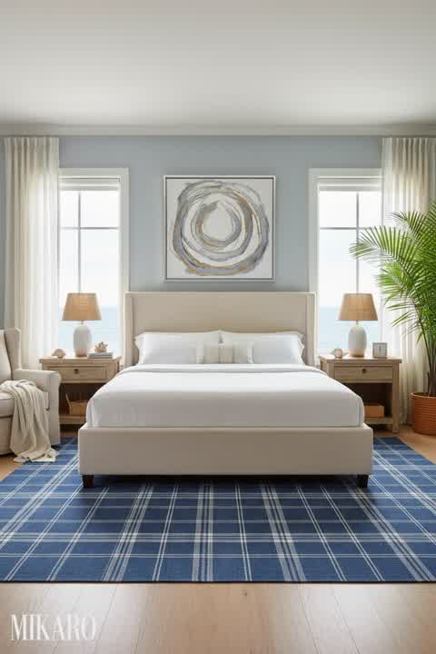 Coastal Living Room Decor: Navy Rug, Modern Vases & Gold Lamp for Elegant Home Style