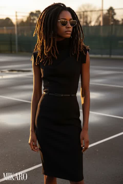 The vibrant cobalt dress and sleek belt create a sophisticated and eye-catching look, beautifully contrasting with the natural, wild setting.