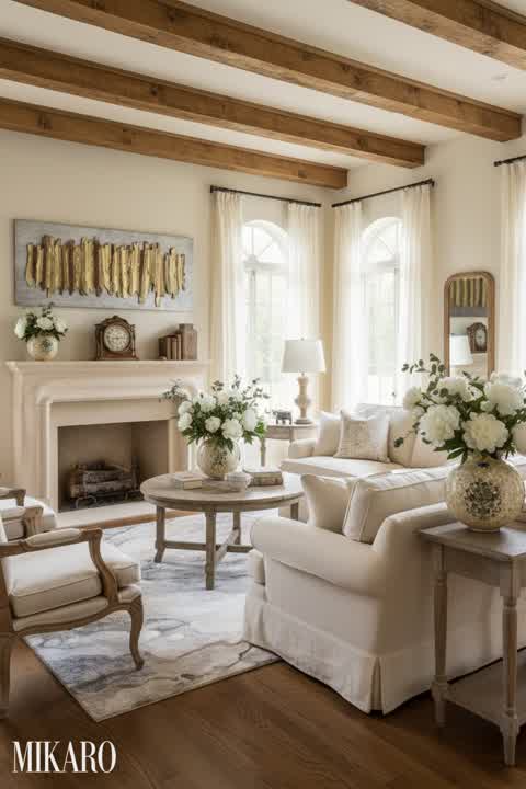 The French Country style works here by providing a soft, warm, and inviting backdrop that beautifully balances the modern lines and vibrant color of the orange velvet sofa. The neutral tones in the art and the delicate glass leaves of the lamp introduce refined textures and subtle elegance, preventing the bold sofa from overwhelming the space. This curated approach creates a luxurious yet comfortable atmosphere, true to French Country's sophisticated charm.