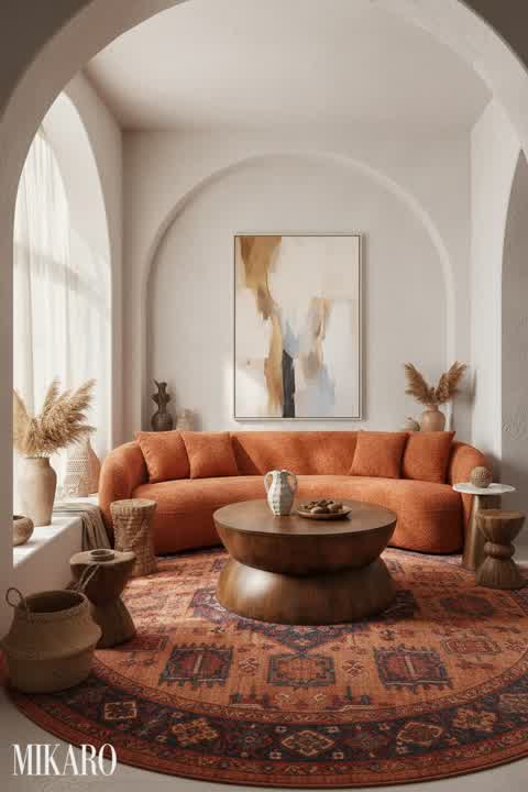 This image presents a Global Fusion homework station in a utility room. The combination of the modern coffee table, the seashell-patterned lamp, and the psychedelic rug creates a truly eclectic, albeit somewhat chaotic, aesthetic. The raw concrete flooring and exposed brick walls provide an interesting industrial backdrop, but the overall composition feels a bit disjointed, as if several distinct styles are vying for attention rather than harmoniously blending.