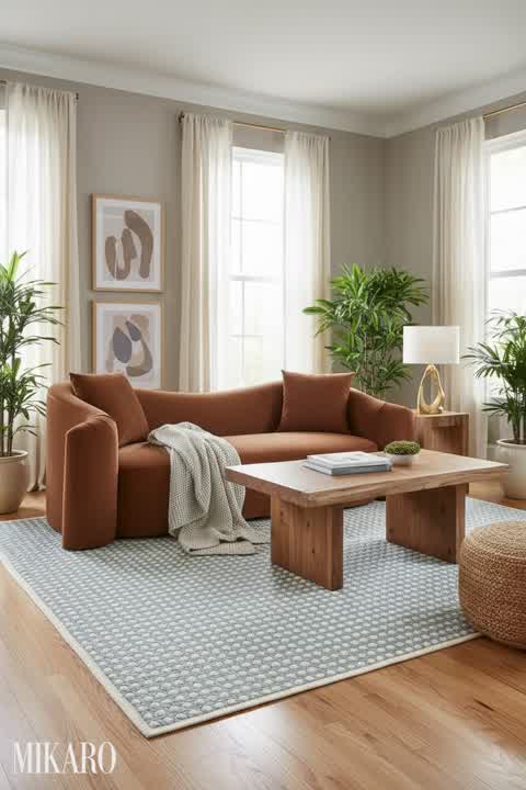 Global Fusion Living Room Decor with Abstract Art, Neutral Rug & Koppel Vase