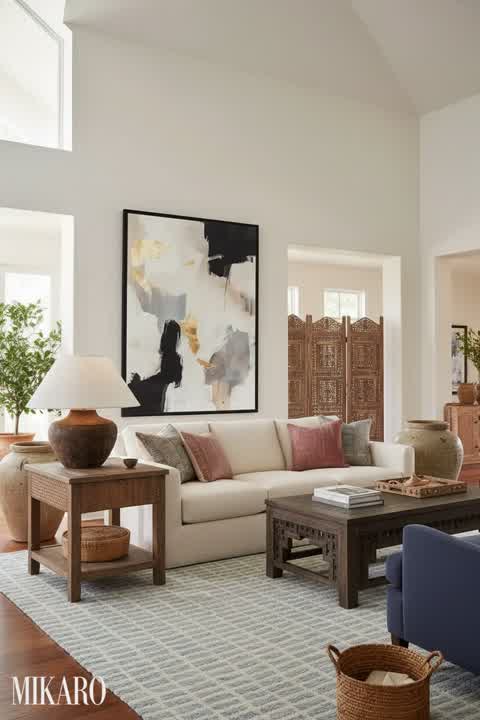 The Global Fusion style thrives on the intentional juxtaposition of diverse cultural elements. The floral rug introduces a bohemian, handcrafted warmth and vibrant color that immediately grounds the space. The sleek, modern Nordic lamp provides a contemporary counterpoint, preventing the floral pattern from overwhelming and adding a minimalist, functional design touch. Finally, the classic silhouette of the sofa, even with a bold pattern, offers a familiar anchor, creating a harmonious blend of old and new, local and global. This balance ensures the space feels curated and cohesive rather than chaotic.