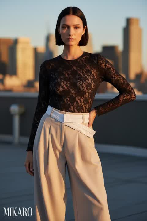 The combination of the shimmering sweater and the structured tapered trousers creates a balanced and sophisticated look. The textures play well together, offering an understated elegance for various occasions.