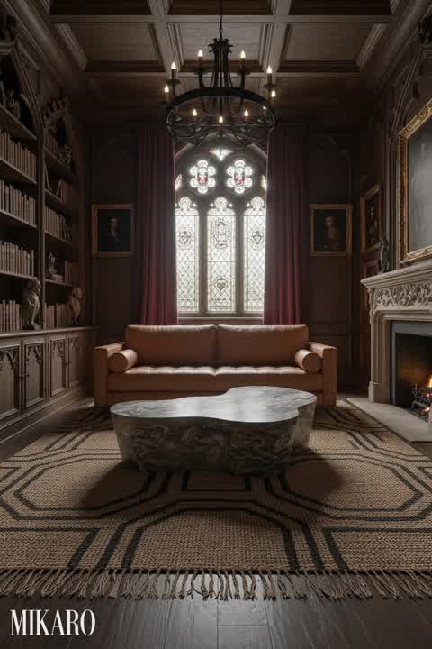 The converted attic space truly embraces the Gothic aesthetic with its dark walls, exposed timber beams, and dramatic lighting. The neon accents add a modern edge, though the combination of the geometric rug and abstract art feels a bit disjointed. The boucle chair, while comfortable, doesn't quite blend seamlessly into the overall moody atmosphere, creating a slight stylistic clash.