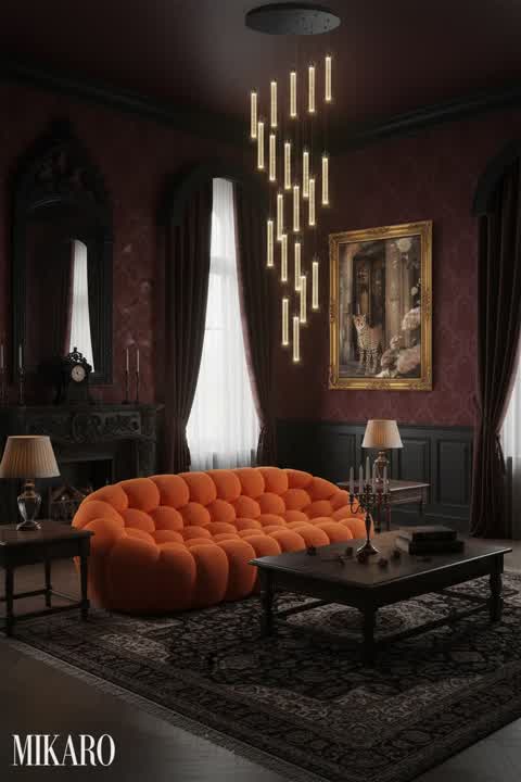 Gothic Living Room Elegance: Plush Sofa, Geometric Art, & Modern Lighting