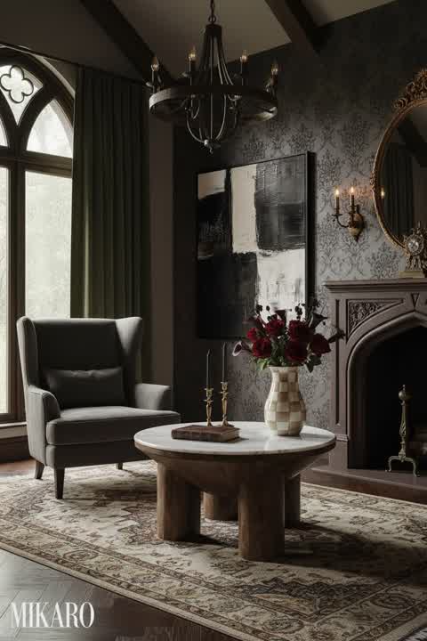 This composition flawlessly integrates contemporary pieces into a Gothic aesthetic by leveraging a deep, rich color palette and classic architectural elements. The bed's clean lines are softened by luxurious drapes, while the boucle sofa provides a contrasting texture that prevents the space from feeling overly heavy. The rug anchors the seating area, introducing a traditional pattern that harmonizes with the overall opulence and grandeur typical of Gothic design, creating a balanced and inviting yet dramatic environment.