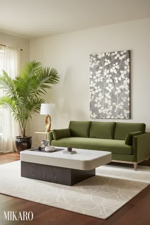 The Hollywood Regency style thrives on bold contrasts, reflective surfaces, and a touch of the dramatic. The Mermaid art piece, with its dark, mysterious depth and golden frame, immediately provides a focal point of sophisticated drama. The glass and gold coffee table adds the necessary reflective glamour and geometric interest, while the seashell lamp introduces a subtle organic pattern and a classic ceramic element. The choice of soft blues and whites in the lamp beautifully complements the dark art and warm gold tones, creating a balanced yet undeniably opulent aesthetic that is characteristic of the style. Each piece contributes to a luxurious, curated feel without overwhelming the space, adhering to the principle of refined extravagance.