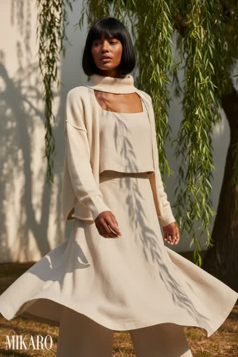 The outfit offers a sophisticated yet relaxed aesthetic, with the wrap top beautifully complementing the unique silhouette of the lantern pants.