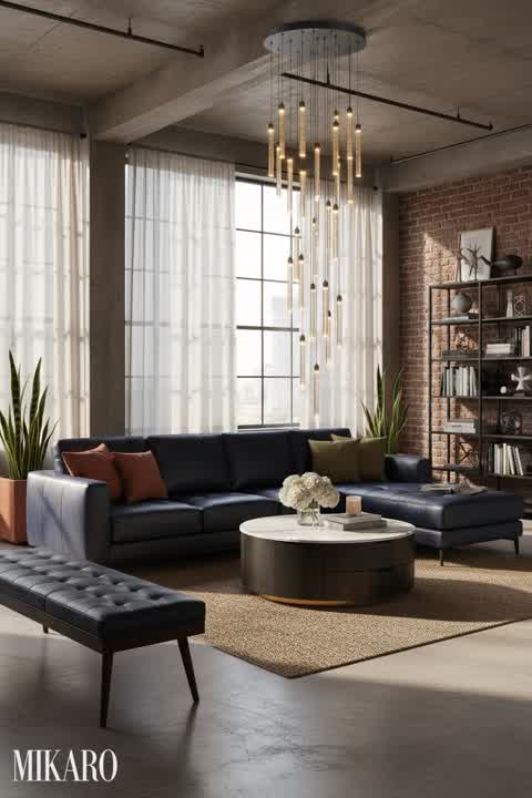 The composition successfully integrates the three products into an industrial setting. The rich cognac leather of the couch and the warm tones of the vase beautifully complement the golden accents of the chandelier and the exposed brick. While the chandelier's traditional wagon wheel design might initially seem a softer contrast to the harsh industrial elements, its antique brass finish and simple form blend surprisingly well, adding a touch of classic elegance without overpowering the raw, urban feel. The overall impression is one of sophisticated warmth within a rugged environment, creating a highly desirable and functional living space.