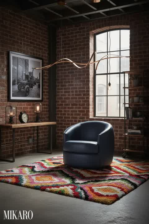 The blend of industrial brick and concrete with the plush sofa and traditional rug creates a surprisingly cozy yet edgy media room. The pendant light adds a warm, organic touch that complements the overall aesthetic well, making the space feel intentionally curated despite the stark backdrop. It's a successful juxtaposition of textures and styles.