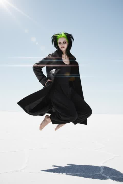 The classic dress with the punk hair creates a striking, rebellious elegance. It's bold and unexpected, making a powerful statement.