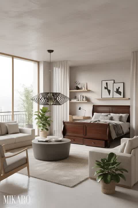 I believe this composition effectively integrates the provided products into a cohesive Japandi aesthetic. The black boucle sofa, while a bold choice for Japandi, works surprisingly well as a grounding element, creating a dramatic focal point without overwhelming the serene atmosphere, especially when balanced by lighter tones elsewhere. The abstract artwork perfectly complements the rug and introduces subtle metallic accents that prevent the space from feeling too stark. The overall design feels high-end and thoughtful, aligning with clever space designs and elevated interiors. The contrast is engaging, and the textures add a layer of sophistication that would appeal to those seeking a balanced, modern, yet tranquil living space.