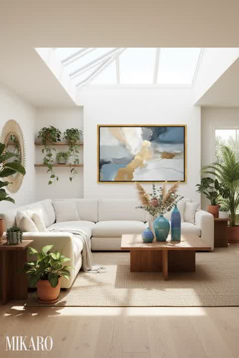 This Biophilic design works exceptionally well by seamlessly integrating natural forms, textures, and colors. The deep green boucle sofa acts as a grounding element, mimicking lush foliage, while the marble plant pot introduces organic materials and the subtle elegance of nature. The 'Homme I' artwork, though abstract, uses earthy tones and mixed media to evoke natural decay and renewal, adding an artistic touch without disrupting the biophilic harmony. Together, these elements create a calming, rejuvenating space that fosters a connection to the natural world, even indoors.