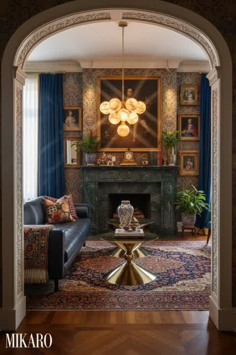 The composition successfully blends maximalist decor with an organic setting, showcasing the items in a grounded and rich manner. The interplay of high-end textures and the dramatic dark blue art against the warm plaster creates a striking, yet harmonious, visual. It truly embraces the 'fill the void' mantra of maximalism while maintaining an elevated aesthetic.