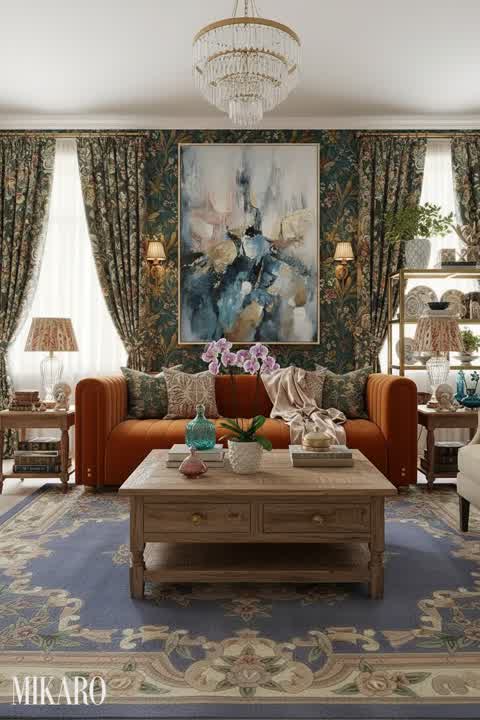 Maximalist Living Room Decor: Indigo Art, Boho Rug & Quirky Leg Lamp – High-End Interior Design