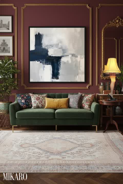 This maximalist approach works because it meticulously layers diverse elements—art, textures, and curated objects—to create a cohesive narrative rather than chaotic clutter. The 'Moody Floral' print serves as a grounding focal point, allowing the vibrant ceramic vases to pop, while the substantial bed frame provides a stable foundation for the room's rich visual tapestry. The carefully chosen pieces, despite their individuality, harmonize through a shared sense of opulence and attention to detail, creating an inviting and visually stimulating environment.
