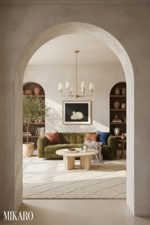 The resulting image beautifully captures a Mediterranean aesthetic with inviting warmth. However, the multi-colored striped rug, while adding a pop of color, clashes slightly with the overall serene and earthy tone of the Mediterranean style. It feels a bit out of place, detracting from the cohesive, high-end feel the other elements suggest.