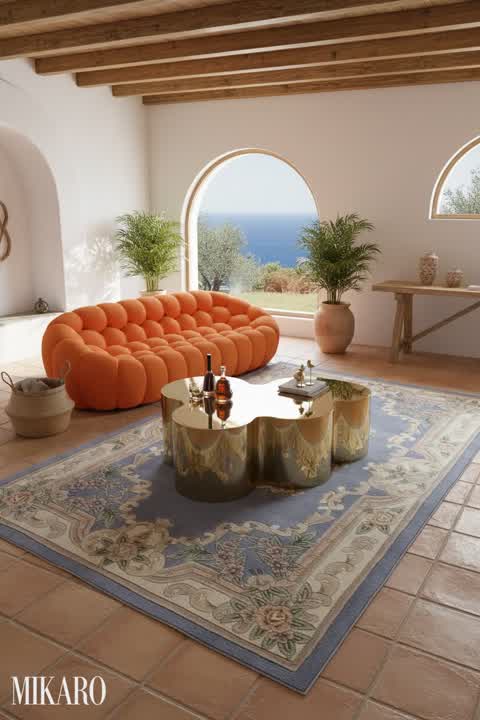 This curated Mediterranean style works beautifully by blending the warmth of the red traditional rug with the rich Sienna leather sofa, creating a grounding and inviting base. The modern, elegant coffee table with its white marble top and gold accents provides a contemporary contrast, adding a touch of sophistication and lightness that prevents the space from feeling overly traditional. The interplay of textures and the balance between classic and modern elements contribute to a harmonious and aesthetically pleasing environment.