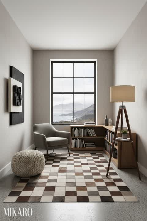 The created image successfully integrates the specified hero products into a modern home theater. The color palette is cohesive, and the textures are visibly high-end. The woodchip wallpaper and radiator, however, create a slight visual dissonance with the otherwise sleek modern elements, making the overall aesthetic feel a bit less refined than it could be. The composition is well-executed, offering an elevated editorial view that showcases the items effectively.