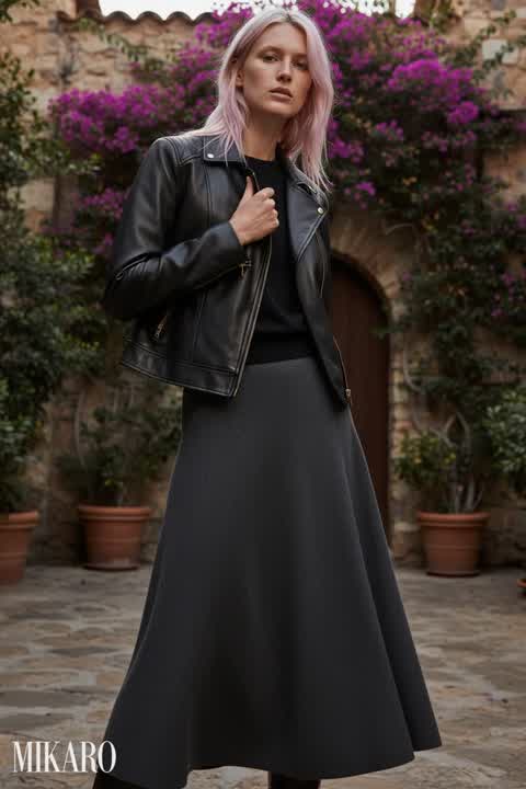 The contrasting textures of the soft knit and the glossy faux leather create an interesting dynamic. The pleated skirt adds a playful touch, while the mock neck keeps it sophisticated. A bold and stylish combination.