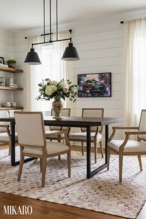 This Modern Farmhouse aesthetic works beautifully by contrasting the plush, inviting textures of the boucle bed with the clean lines and polished finishes of the brass lamp and marble coffee table. The neutral color palette, dominated by creamy whites and natural wood tones, provides a serene backdrop, while the subtle hints of brass and marble introduce an element of refined luxury. The juxtaposition of contemporary pieces with a rustic-inspired setting creates a balanced and sophisticated yet comfortable environment.