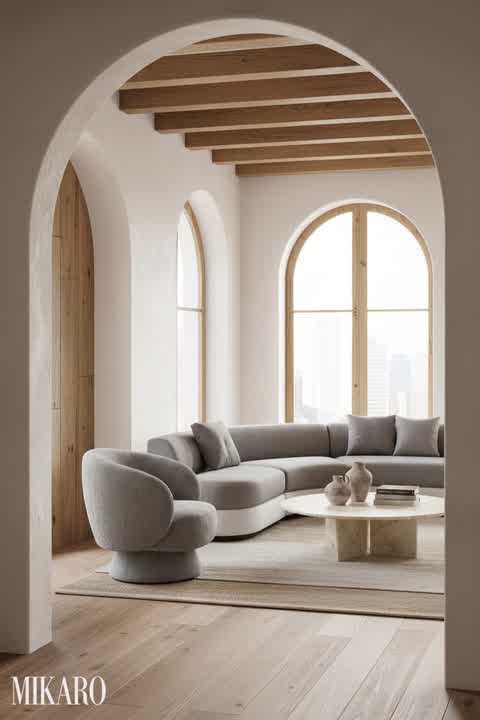 The brutalist concrete walls provide a striking contrast to the warmth of the modern farmhouse elements, which feels unexpected but ultimately creates an inviting tension. The selection of materials, like the plush sofa and textured rug, softens the industrial backdrop effectively. The overall composition feels balanced, although the accent chair might be a touch small for the grand scale of the room.