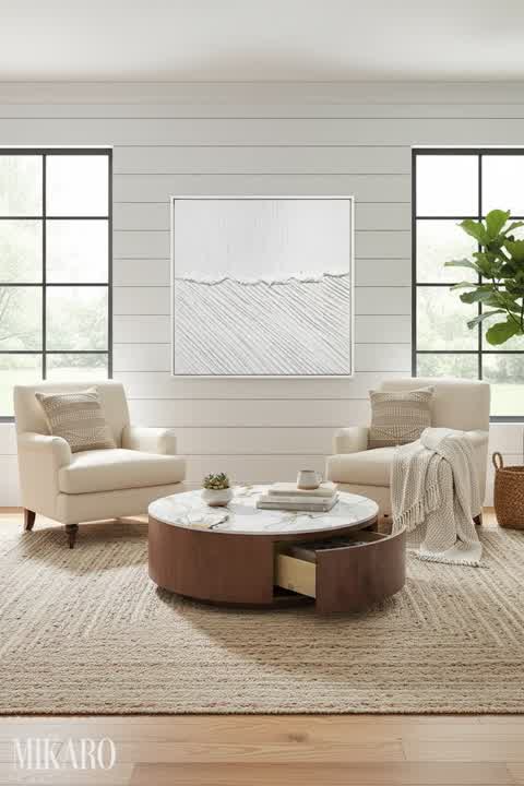 The composition successfully integrates the products into a Modern Farmhouse aesthetic. The vibrant abstract art piece acts as an effective counterpoint to the otherwise neutral and earthy tones, preventing the space from feeling too subdued. The placement of the vase and rug is logical and functional within the living room setup. The choice of sheer curtains ensures the room remains bright and inviting, which is crucial for a farmhouse style that often emphasizes natural light. While the art's strong colors are a bold choice for a typically serene farmhouse palette, they bring a welcomed, unexpected contemporary twist.