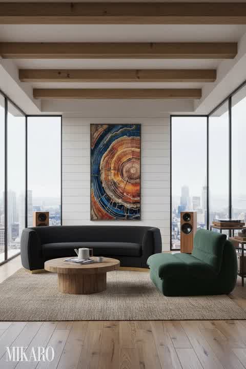 The composition aims for a soft-minimalist Modern Farmhouse aesthetic. While the individual pieces are strong, the abstract art and sculptural pendant light introduce a stark contrast that may feel less cohesive with the overall 'farmhouse' warmth, leaning more towards a modern art gallery than a dressing room. The blue leather sofa is a comfortable anchor, but its vibrancy pulls focus from the intended gentle farmhouse feel.