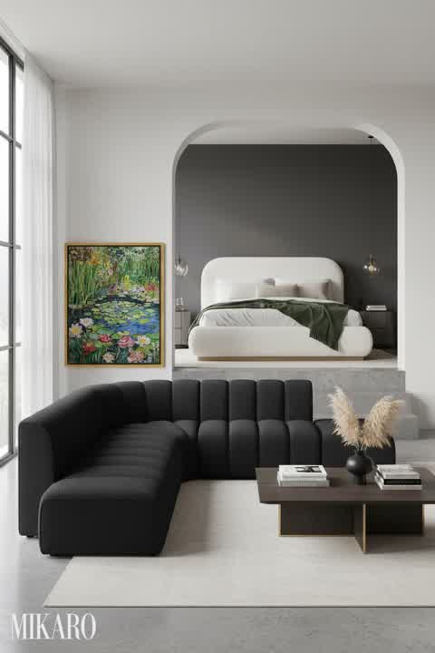 The composition is visually appealing and achieves a harmonious balance between different textures and forms. The floor lamp, while named 'Medieval,' surprisingly integrates well into this Modern setting due to its minimalist, abstract shape, offering a delightful juxtaposition. The coffee table's natural wood provides essential warmth, preventing the room from feeling too stark, and contrasts beautifully with the clean lines. The textured white art piece adds depth without overwhelming the space. The overall effect is one of understated elegance and comfort, which I believe would resonate strongly with an audience seeking sophisticated yet livable Modern design.