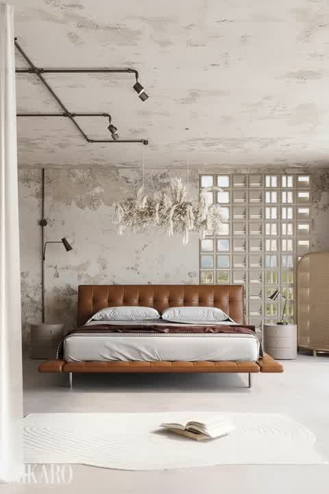 The Neo-Industrial style effectively marries the raw, exposed elements of concrete and brick with the warmth of natural wood and soft textiles. The industrial lighting and large-scale art piece provide visual anchors, while the organic lines of the bed and the classic floor lamp add an unexpected touch of luxury and comfort, preventing the space from feeling too austere.