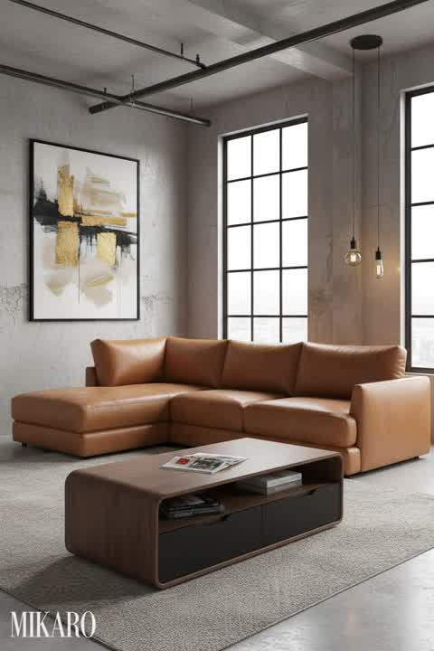 Neo-Industrial Living Room: Earthy Sofa & Crystal Shine