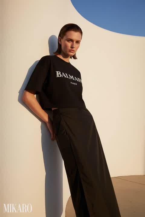 This outfit perfectly blends casual comfort with high-fashion tailoring. The contrasting silhouettes create a unique and stylish look that is both relaxed and sophisticated.