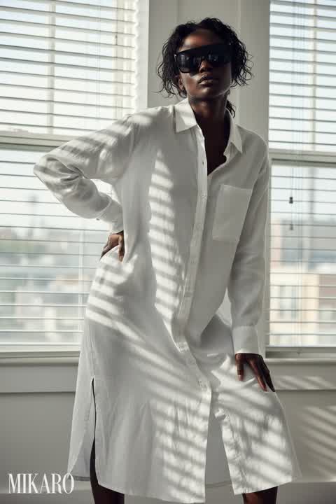 The blouse's unique cut pairs intriguingly with the form-fitting skirt, creating a sophisticated and avant-garde look. Makeup and hair add to the edgy vibe.