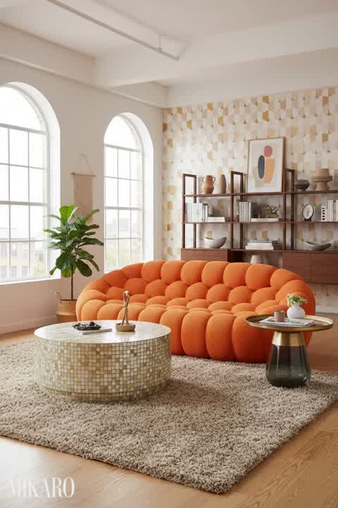 Retro Bedroom Oasis: Sleigh Storage Bed, Abstract Art & Black Floor Vases
