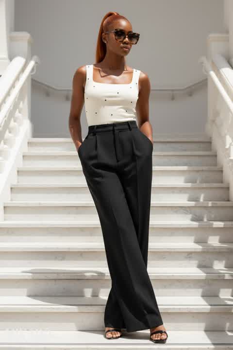 This outfit is a delightful blend of playful ruffles and structured chic, perfect for a statement look.