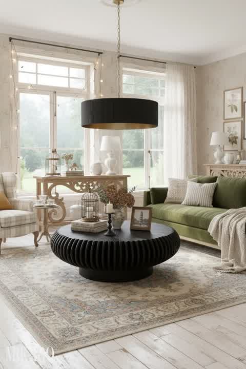 I find this composition to be quite charming and largely successful for a Shabby Chic aesthetic. The velvet bed frame, while a bit more modern than traditional Shabby Chic, surprisingly blends well due to its soft texture and muted green color, adding a touch of understated luxury. Placing the drum coffee table at the foot of the bed is an interesting choice; it definitely makes a statement and could serve as a unique seating or display area, though its dark color provides a strong contrast to the otherwise light palette, which could be polarizing. The Nordic glass vase with its blue and amber tones beautifully complements the room's soft colors and adds a touch of subtle sophistication. The distressed dresser and ornate mirrors perfectly capture the essence of Shabby Chic. Overall, the room feels inviting and thoughtfully curated, balancing new pieces with classic elements effectively.